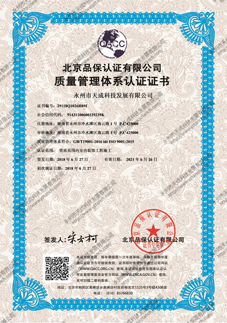 质量管理体系认证证书(室内装饰)