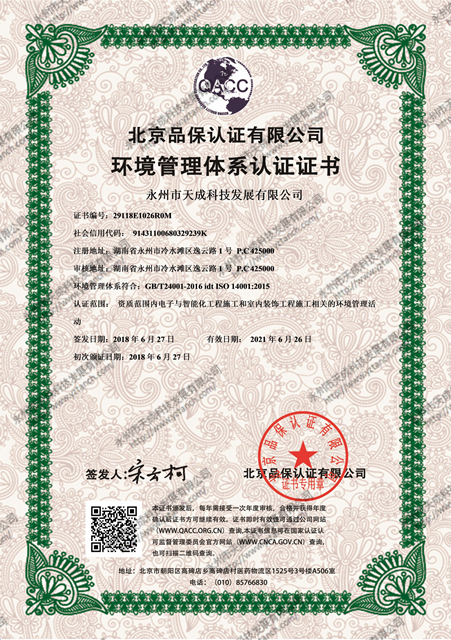 环境管理体系认证证书